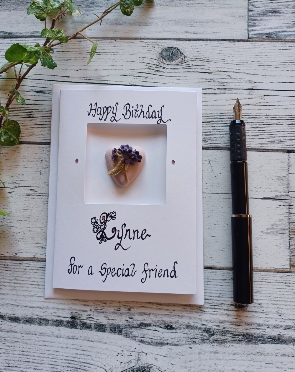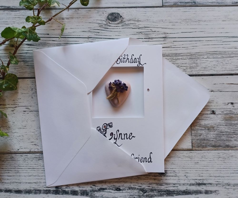 Placed on the card is a pink heart-shaped concrete pebble decorated with a small bunch of paper lilac flowers.